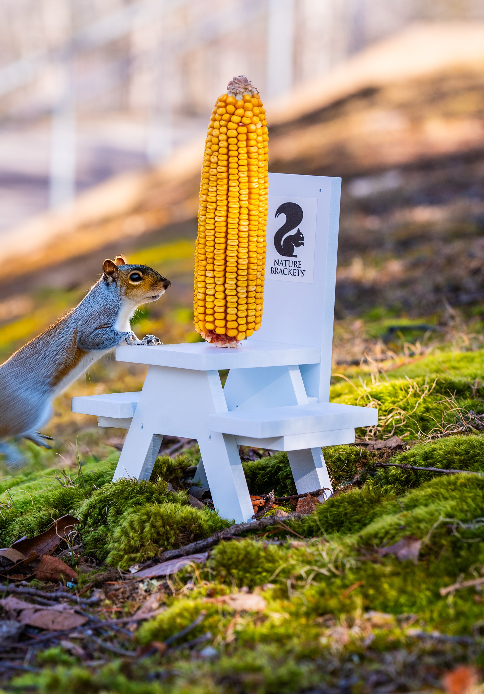 Our feeders provide a cozy haven for playful squirrels, featuring a secure PVC picnic table designed to hold a tasty ear of corn. Embrace the charm of wildlife interaction with a Nature Brackets Squirrel Feeder!